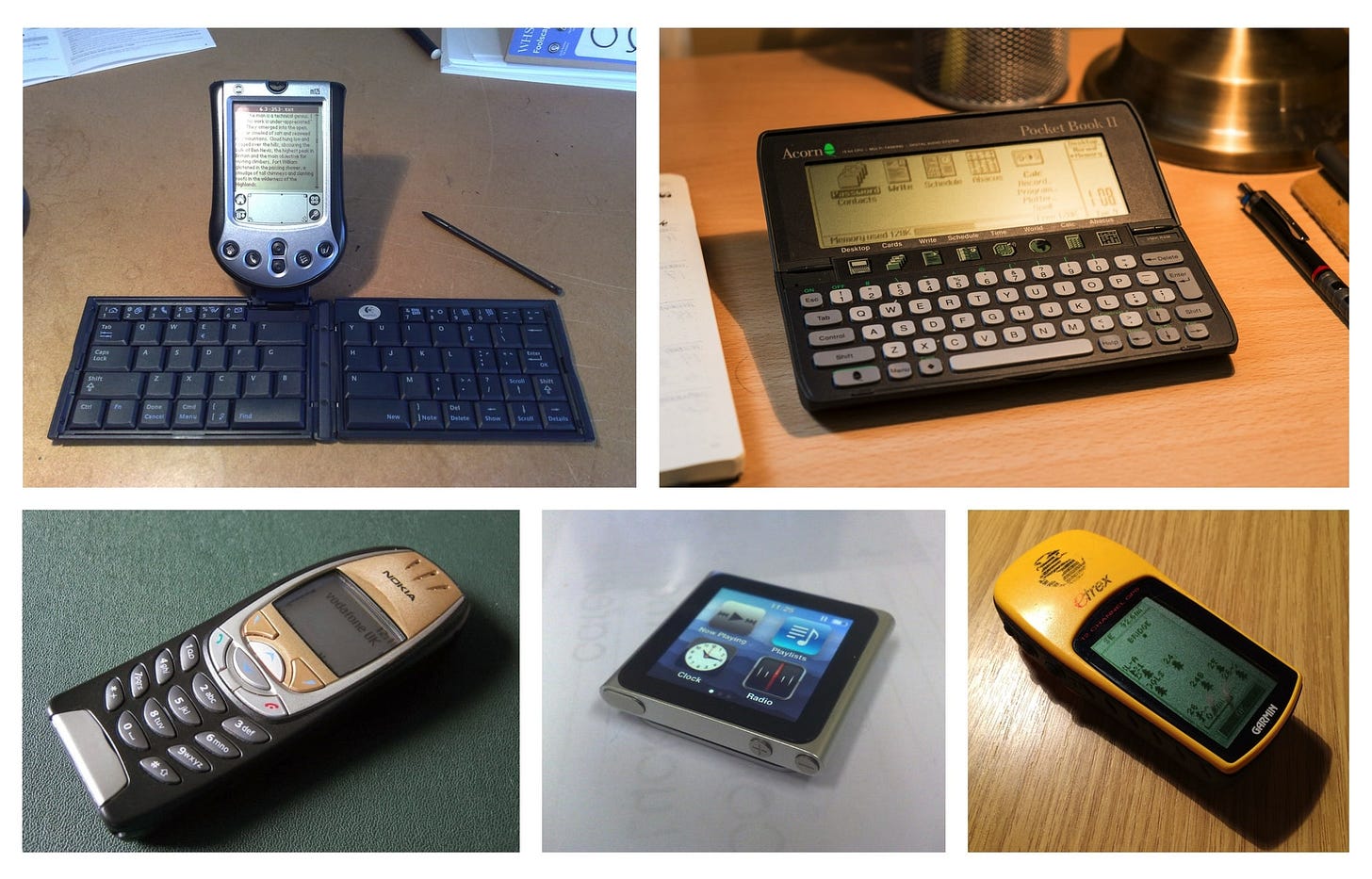 More and more consumer gadgets combined features. At first this was gradual – a Palm Pilot with a camera, or one with an expansion slot so you could add GPS or a phone antenna. Back then, most people had a basic phone that could do nothing but call and send/receive texts, plus a separate CD or MP3 player. Sat-navs were common accessories for cars and handheld GPS was widespread in the mountains.