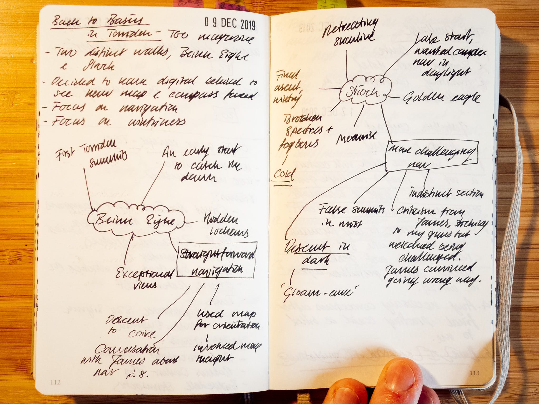 From PB6, p.112 and 113, December 2019: thinking on paper while writing an article for The Great Outdoors called ‘Back to Basics’. This is a glimpse into my planning process for any article. Mind mapping on paper is how I order my thoughts. Appropriately, the article was about picking up paper maps again after years of digital mapping.